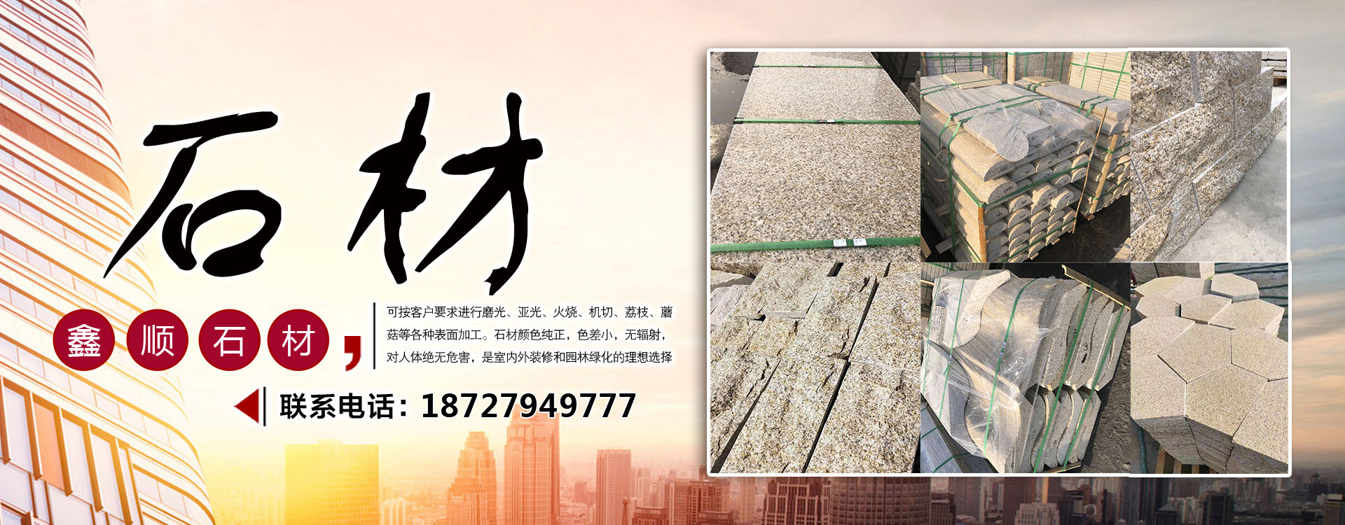 隨州市鑫順石材有限公司位于湖北省隨州市隨縣萬和鎮(zhèn)桐柏山。是一家集礦山開采、石材加工、異形制作、產品銷售為一體的大型綜合型石材企業(yè)!本公司主要經營:中花白麻,小花白麻,黃金麻,黃金鉆,芝麻灰,鐘山青,芝麻黑,泌陽紅,各類異形石材。生產的石材規(guī)格齊全、做工精細,被廣泛用于外墻干掛、廣場地鋪、市政園林、建筑工程、環(huán)境景觀異形石材等各類建筑墻體、地面的裝飾裝修。公司專注于石材行業(yè)多年,生產優(yōu)質的無色差優(yōu)質白麻,永不吐銹量大,穩(wěn)定,主攻高鐵站,地鐵站,機場等大型市政房產??沙薪痈鞣N異形加工,速度快,質量無憂。我們秉承“誠信經營,服務為本”的經營理念,竭誠為廣大客戶提供優(yōu)質的產品和滿意服務,期待與您的合作,竭誠歡迎國內外新老客戶前來訂購洽談!